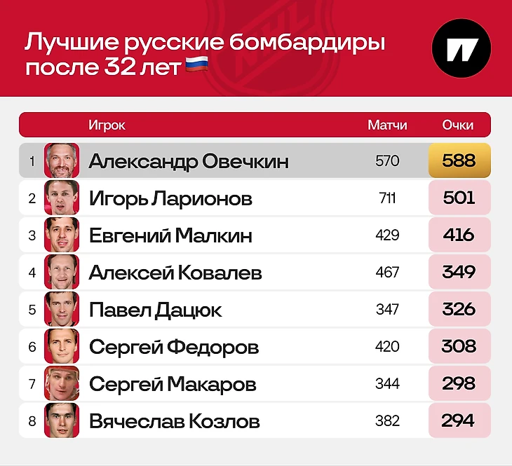 Вот как к старту регулярки-2025/26 выглядела таблица лучших русских бомбардиров после 32 лет (только полные сезоны, возраст – на день старта):