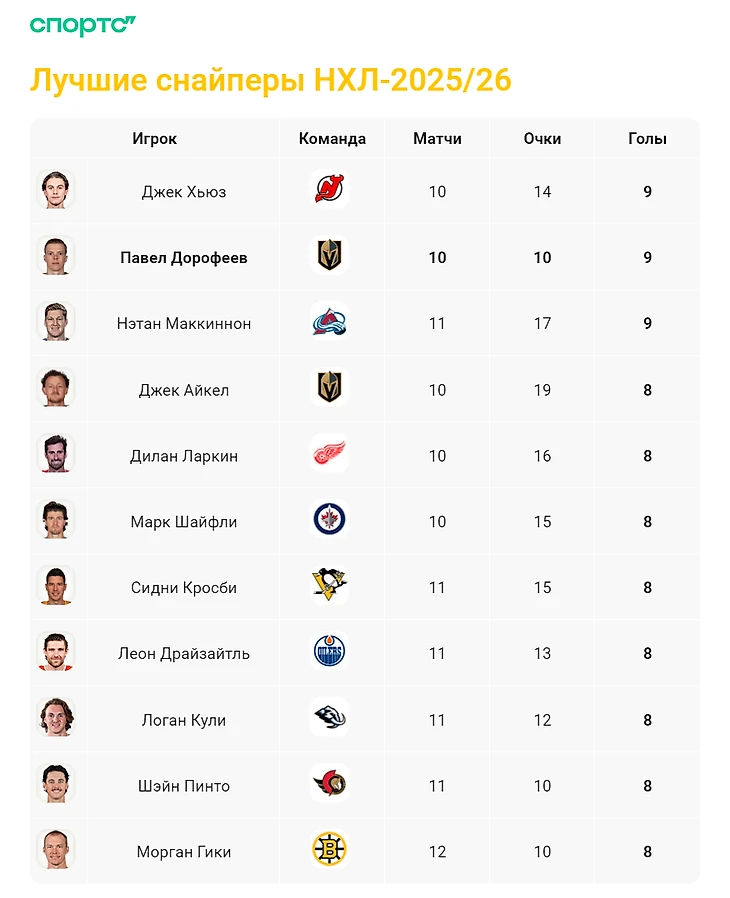 Всего у Дорофеева теперь девять шайб. Он делит первую строчку в топе снайперов с Нэтаном Маккинноном и Джеком Хьюзом.