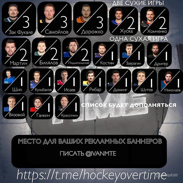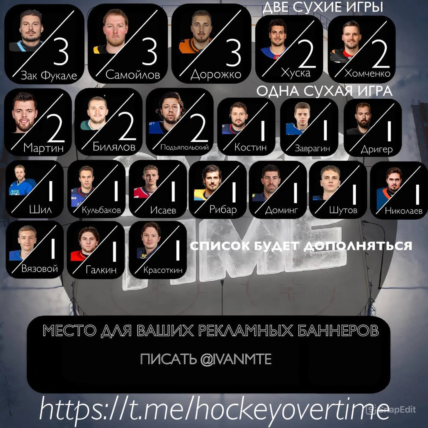 Несколько дней назад мною было принято решение создать фото-графику со всеми «сухими» вратарями нашей лиги. С более точным списком вы можете регулярно ознакомляться в моем телеграм-канале «Овертайм», или же написать прямиком в личные сообщения @ivanmte. Доброго вечера!