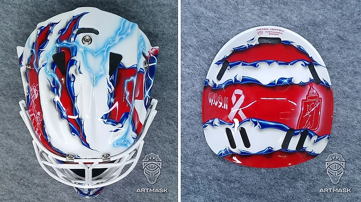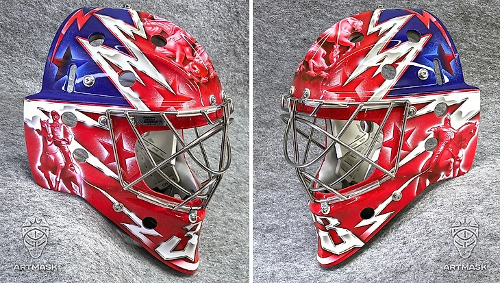 На задней части разводные мосты Санкт-Петербурга, родного города вратаря, и ангел, сложивший руки в молитве. Это изображение вратарь наносит на все свои шлемы, вероятно, в дань памяти о членах семьи, погибших в автокатастрофе в 2014 году.