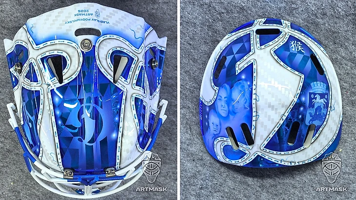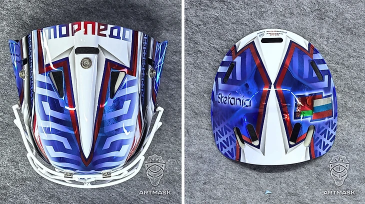 Маске Владимира Галкина отлично подходит характеристика «С уральским вайбом». Шлем вдохновлён природой Урала, отсылки к которой есть на щитках и ловушке вратаря.