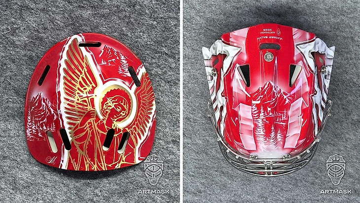 В дополнение к ним Галкин сделал шлем, по бокам которого расположились Уральские горы и талисман «Автомобилиста» – лось. Задняя часть украшена золотым изображением Архангела. Рядом с ним небольшая «М» – первая буква имени жены вратаря Милены.