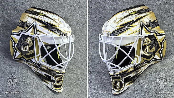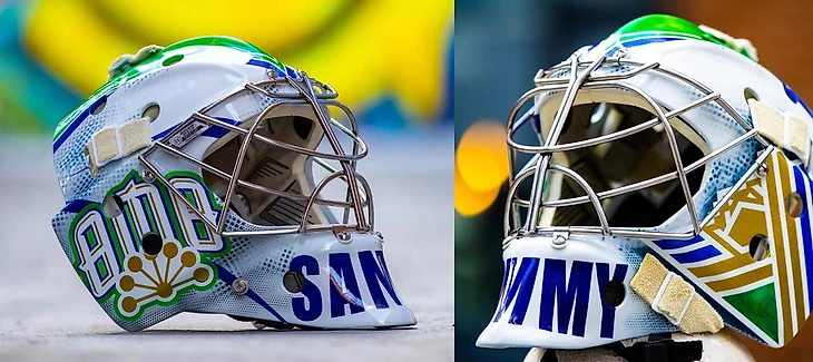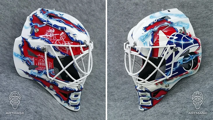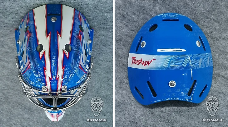 На верхней части зелёная стрелка, обрамлённая синим контуром. На подбородке прозвище голкипера – «Сэмми» на латинице. Теперь эта маска стала частью истории. В новом клубе Александр выступает в полностью белом шлеме.