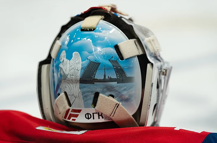 Шлем Егора Заврагина – ещё одна вариация вратарской маски на тему Санкт-Петербурга. По обеим частям расположены достопримечательности города: слева – Дворцовый мост, справа – Ангел на Александровской колонне.