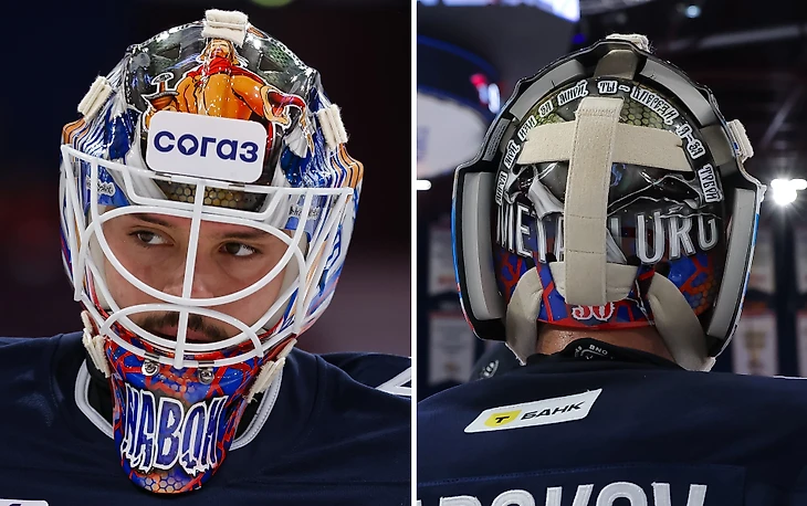 На задней части шлема нанесена морда рыси в фирменном стиле «Северстали». Поверх неё – имена членов семьи Самойлова и собака вратаря.