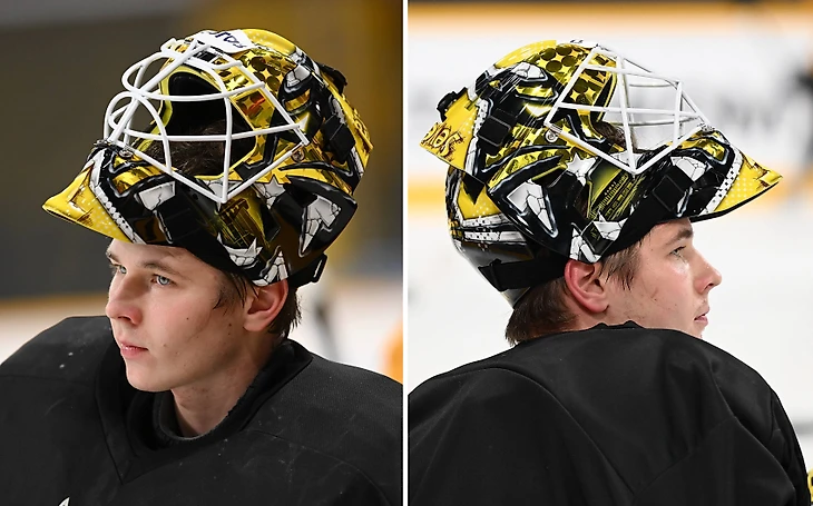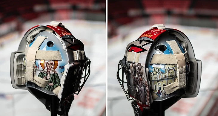 Шлем Даниила Исаева пропитан любовью к Ярославлю. На левой части маски – эмблема «Локомотива», на правой – достопримечательности города: театр имени Волкова, Успенский собор и памятник Ярославу Мудрому. На подбородке – номер Исаева «92».