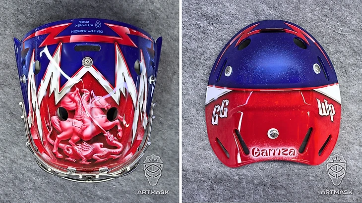 Шлем коренного москвича Гамзина традиционно посвящён родному городу в красно-синих тонах – его украшают скульптурные монументы Юрия Долгорукого и маршала Жукова.