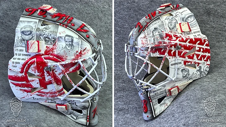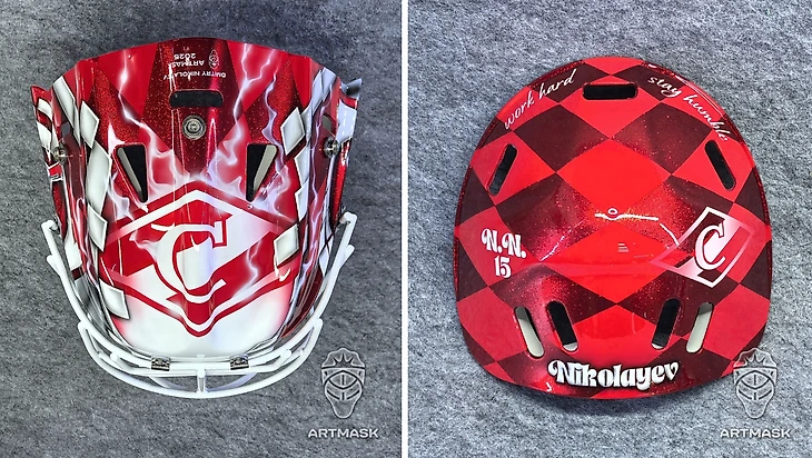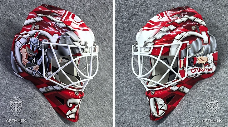 Концепция шлема Артёма Загидулина максимально проста. Весь шлем выполнен в красно-белых цветах, по бокам изображён гладиатор в маске – символ «Спартака». Концепцию дополняют чёрно-серые брызги по всему шлему. На подбородке – номер вратаря 50.