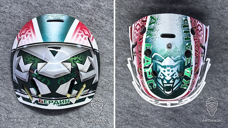 В основу обновлённой маски Михаила Бердина легла клубная символика. На подбородке расположены герб Татарстана, и год основания клуба – 1956. Основная эмблема – барс – появляется несколько раз в разных частях шлема наряду с названиями клуба и города.