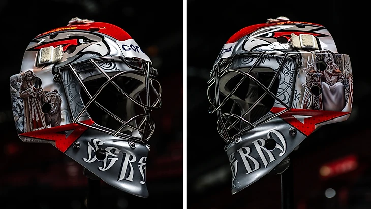 С двух сторон маску украшает ястреб – логотип «Авангарда». Фирменный алый цвет команды используется на верхней части шлема. Справа на маске изображён старорусский бог Велес, слева – Род, отец Велеса.