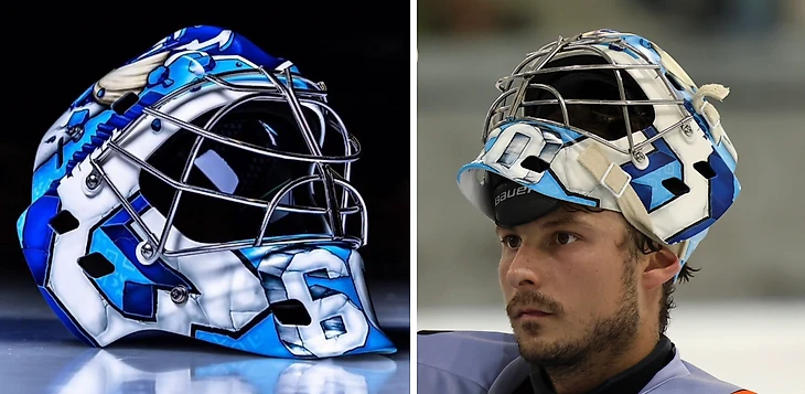 На подбородке номер Хуски – 35. На заднюю часть нанесено изображение собаки по кличке Джимми и сердце с именем жены вратаря Тейлор.