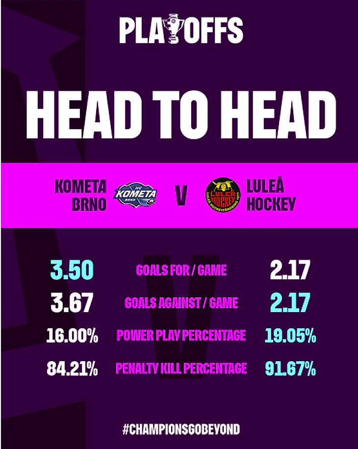 «Лулео» всегда хорошо смотрится дома и умеет реализовывать преимущество домашней площадки. «Комета» имеет очень сильное и агрессивное нападение. Филип Крал, один из ключевых защитников команды из Брно, может пропустить матч из‑за травмы, полученной в национальном чемпионате.