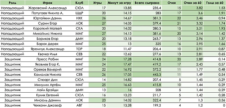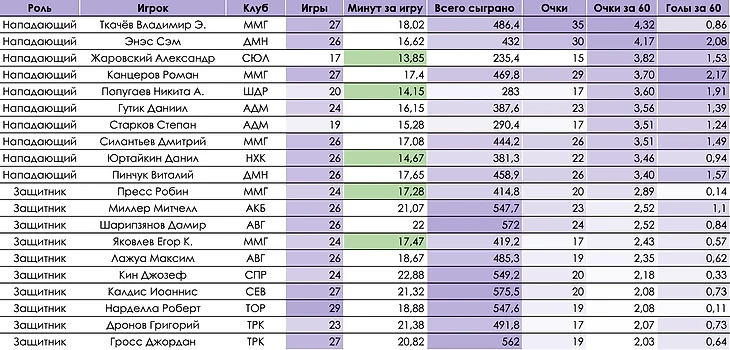 В этой категории форвардов топ выглядит почти как список кандидатов «дайте им на две минуты побольше» — все они проводят по 11–14 минут за игру, но по участию в голах уже играют как топ-6. Жаровский (3.82 очка за 60 минут), Попугаев (3.60) и Юртайкин находятся в лидерах и по всей лиге, и в этом списке. Александр Жаровский в целом выглядит как самый эффективный форвард в лиге, учитывая, что ему всего 18 лет. В рейтинге защитников 4 игрока Магнитки — все они играют ниже среднего для защитников по лиге, но набирают немало очков.