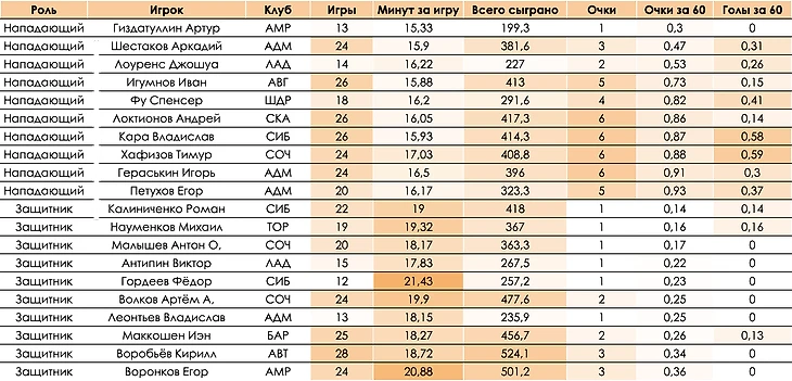 Среди нападающих это, например, ребята вроде Гиздатуллина (Амур) или Шестакова (Адмирал): по 15–16 минут за матч, но менее 1 очка за 60 минут игрового времени. У защитников внизу списка по темпу — Калиниченко (Сибирь), Науменков (Торпедо), пара защитников Сочи и Лады: много есть времени, но почти нет очков. В целом, в этом списке преобладают игроки Адмирала и Лады — команд, которые в числе самых зависимых от своих топ-5 бомбардиров, а остальная команда набирает меньше очков.