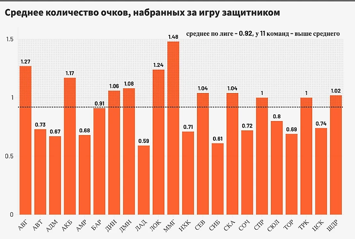 В среднем по лиге сейчас форварды набирают 1.86 очка за 60 минут, защитники — 0.92 очка за 60.