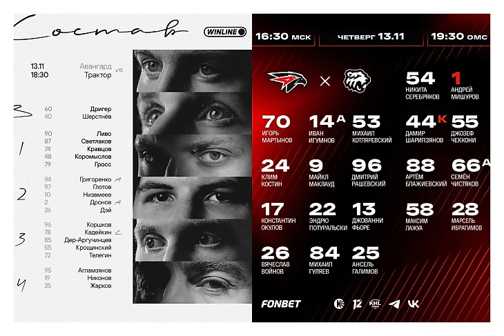 После не самого приятного матча против питерского СКА омичей ждала другая проверка на прочность, у которой не все так хорошо в последних матчах — челябинский «Трактор» с Бенуа Гру во главе. Встреча прямо отсылала к тому самому голевому пиршеству в городе-родине «белых медведей», где «ястребы» в довольно нетипичной манере разобрались с соперником со счетом 5:8. Однако это было в прошлом, поэтому несколько упустим прозвучавшую деталь. Куда более интересно взглянуть на составы команд.
