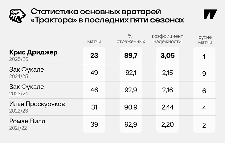 В итоге статистика Дриджера в «Тракторе» стала совсем удручающей: 89,7% ОБ за 23 игры. Это худший показатель для основного вратаря челябинского клуба за последние пять лет. Крис уступает даже Илье Проскурякову, которому на момент выступления за «Трактор» в сезоне-2022/23 было 35 лет.