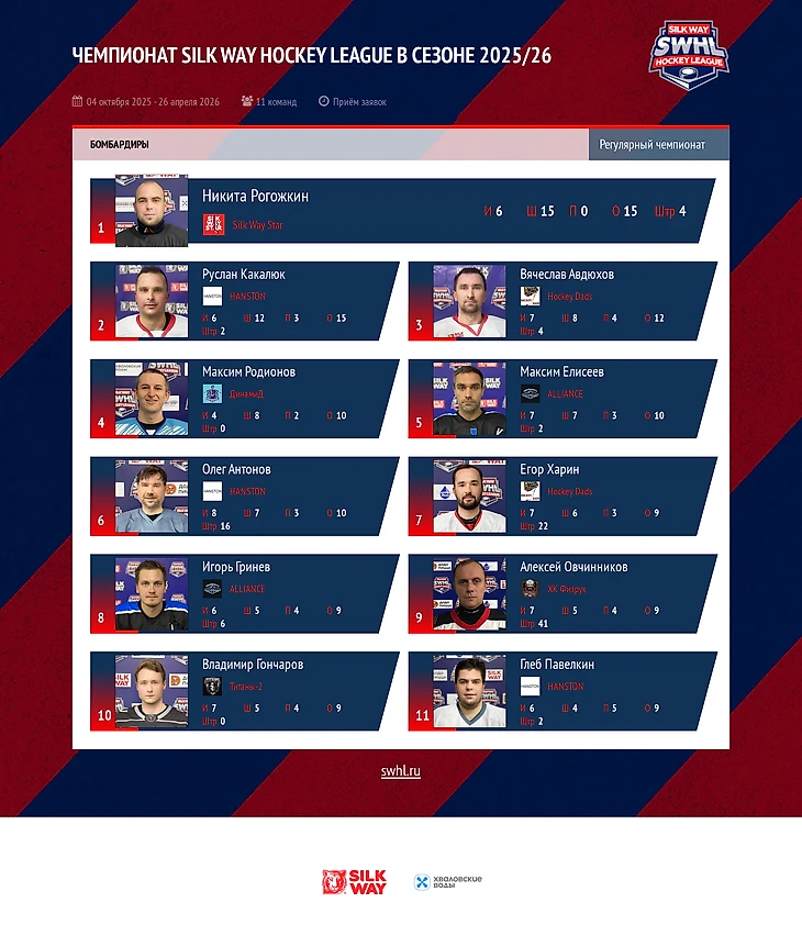Хэт-трик против Титанов-2 помог ему удержать лидерство, но тур для команды вышел непростым. Рогожин продолжает играть в хоккей прямого удара: чуть что — сразу гол. Чистые 15 шайб — это не статистика, это почерк. Король!