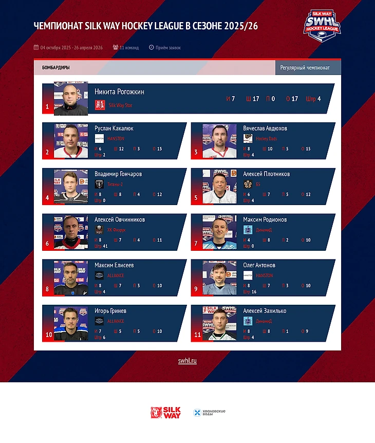 Поражение Silk Way Star не меняет главного факта: Никита Рогожкин остаётся на вершине. 17 очков (15+0) — цифры, которые не просто говорят, а звучат. Буллит и шайба в матче против Hockey Dads стали теми штрихами, которые позволили удержать лидерство, когда давление преследователей уже чувствуется буквально за плечами. Такое лидерство нельзя присвоить, его можно только заслужить игрой.