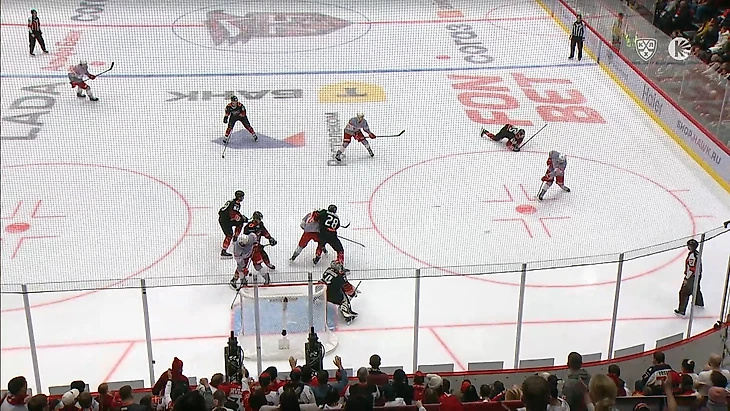В данном эпизоде вообще всех «ястребов» хочется выделить лишь с положительной стороны. Подобная самоотверженность, стремление лечь на шайбу всеми частями тела, лишь бы помешать ей дойти до створа ворот, напомнила мне про 6-ю игру Финала Кубка Гагарина 2021, когда Омск играл против ЦСКА и также остался втроем против пятерых.