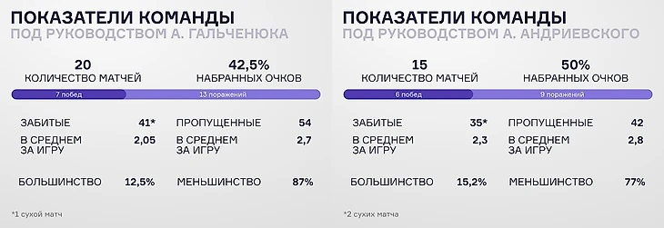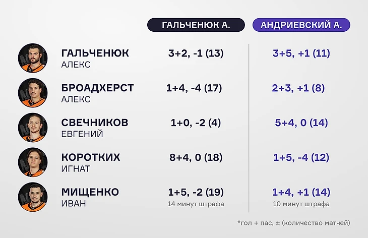 Если брать расклад в течение двух первых месяцев регулярного чемпионата, то из топов (на момент игры с соперником!) у Гальченюка – дважды «Северсталь», Минск, «Автомобилист», Шанхай. Команда проиграла дважды «Сибири», «Барысу», но выиграла дважды «Нефтехимик». Андриевский провел серии, в которых были дважды СКА, «Локомотив» и «Трактор». По одной игре с Минском, «Автомобилистом», «Металлургом», «Динамо», «Авангардом». Команда один раз победила «Адмирал» и дважды проиграла, а также потерпела обидное поражение от «Сочи».
