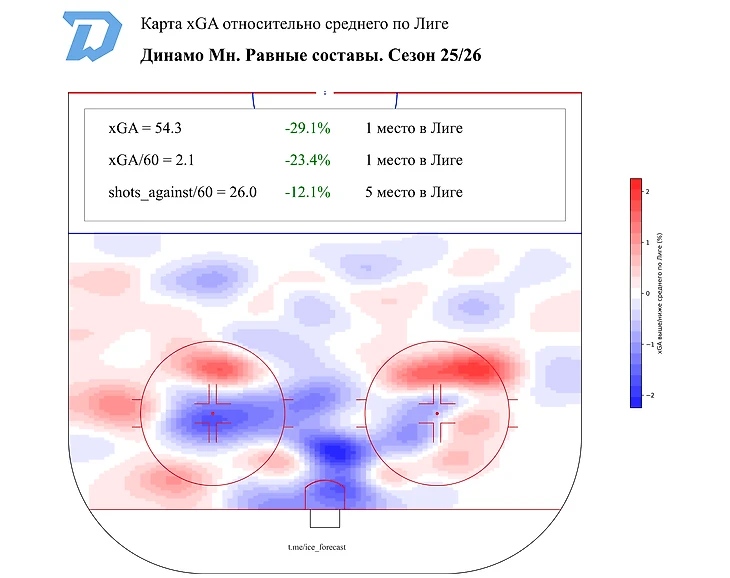 По продвинутым метрикам нет команды лучше по ожидаемым пропущенным голам (xGA): только ЦСКА и «Адмирал» находятся в пределах 15 пропущенных шайб по xG, но им для этого приходится жертвовать атакой. В то же время минчане уступают лишь «Металлургу» по опасности создаваемых моментов.