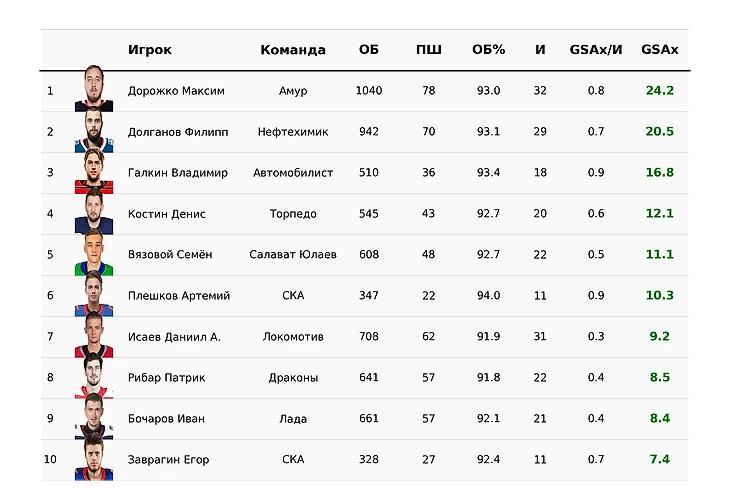 Единственный голкипер с сопоставимым объёмом работы — Филипп Долганов, второй преодолел отметку в 20 GSAx и держит «Нефтехимик» в середине таблицы конференции, при том что его сменщик Ярослав Озолин в 8 матчах пропустил на 4,3 шайбы выше ожидаемого.