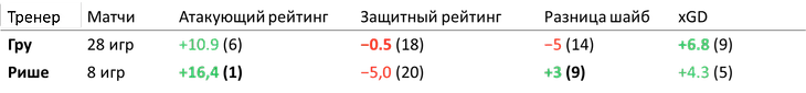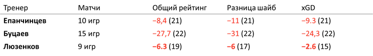 В Челябинске произошла обратная ситуация: недолгая история Рафаэля Рише запомнилась яркими атакующими перфомансами и одновременно катастрофическими показателями в обороне. В 8 матчах «Трактор» одержал лишь 2 победы и при лучшем атакующем рейтинге и неплохих показателях по xG входил в тройку худших по оборонительным метрикам.