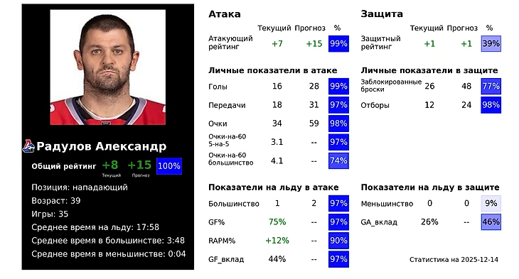 Немалую роль в этом играет вратарская линия: по xGA в равных составах ярославцы лишь седьмые. При этом Даниил Исаев и Алексей Мельничук занимают третье место по проценту отражённых бросков. Главной движущей силой команды остаётся Александр Радулов, проводящий лучший сезон после возвращения в КХЛ в 2022 году и имеющий лучший GF% в лиге среди нападающих (75%).