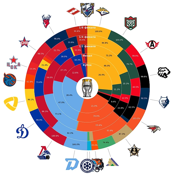 Третьим заметным фаворитом остаётся «Авангард» — главный конкурент «Металлурга» на Востоке. В 7 из 10 случаев омичи добираются до полуфинала. Единственной другой командой, преодолевшей отметку в 10% на Кубок, стал «Локомотив», в четверти симуляций достигавший финала. В широкий круг фаворитов вошли московское «Динамо», «Ак Барс» и «Трактор» — единственные команды с минимум 10% на выход в финал.