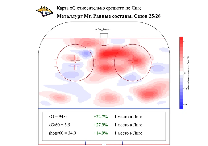 «Металлург» — лучшая команда Лиги по игре в атаке: магнитогорцы лидируют по голам и созданным xG. Кроме того, они входят в топ-3 по всем бросковым метрикам, в том числе занимают первое место по броскам повышенной опасности.