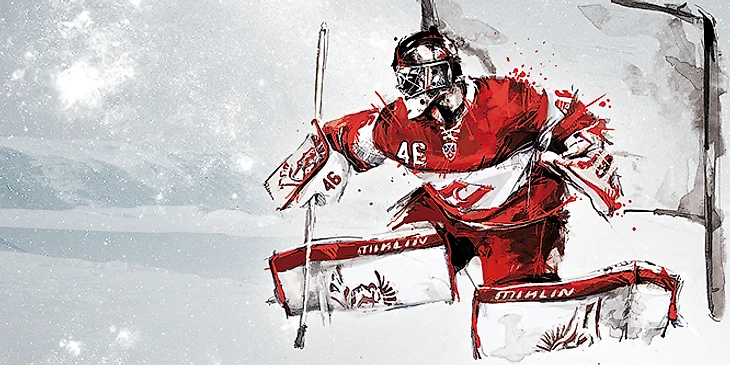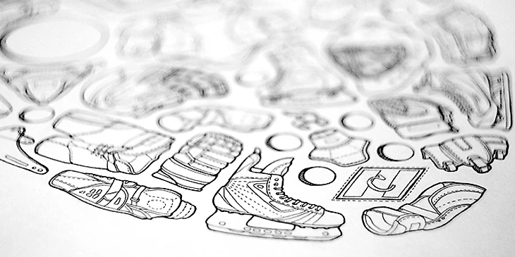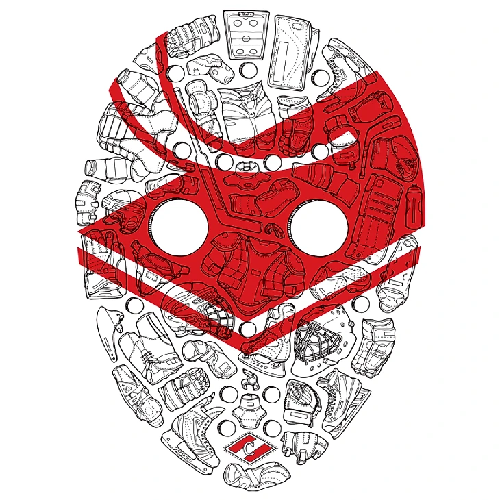 Я рисовал для «Спартака» старую вратарскую маску, состоящую из элементов инвентаря и экипировки. Долго подбирались элементы и компоновка, было несколько эскизов, обсуждали их с Андреем. По-моему, получилось интересно. Если честно, до этой работы я не знал как называется и треть элементов экипировки хоккеиста, теперь знаю всё! Заметил, что люди, которые видят эту картинку впервые, стараются рассмотреть детали, это хороший показатель. А вообще, несмотря на немаленький объем работы, всё получилось быстро и на одном дыхании.