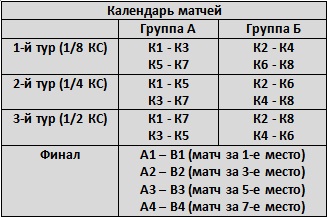 Команды делятся на 2 подгруппы и играют друг с другом однокруговой турнир из 3 матчей (соответственно 1/8, 1/4, 1/2 плей-оффа).