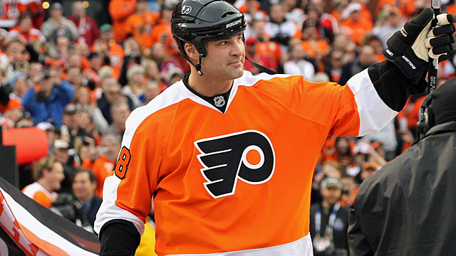Линдросу уже стукнуло 40 лет, из под его шлема выбиваются поседевшие волосы. Но в его лице нет перемен. Оно сохранило все те же черты, которые помнит каждый болельщик «Филадельфии», заставший времена славы Эрика. Все тот же холодный и пронзающий взгляд. Все та же щель между передними зубами. Все тот же мощный подбородок с несколькими шрамами, которые выглядят, словно трещины на граните. Все те же потрясающие руки, которыми он набрал 865 очков и 1398 минут штрафа всего за 760 матчей своей 13-летней карьеры.