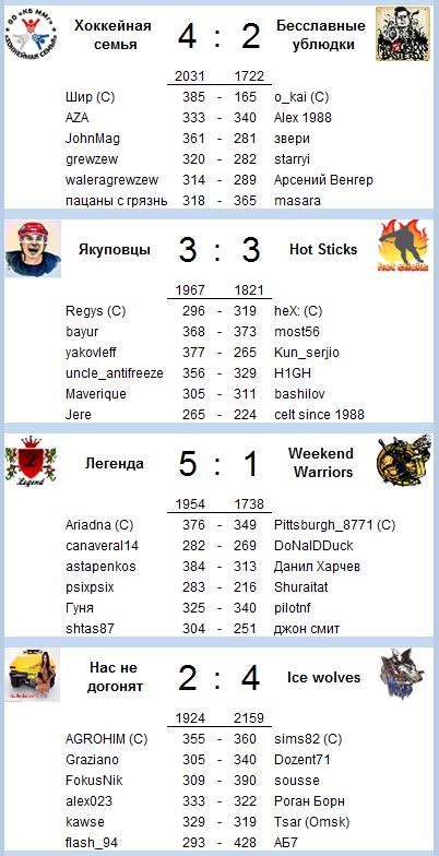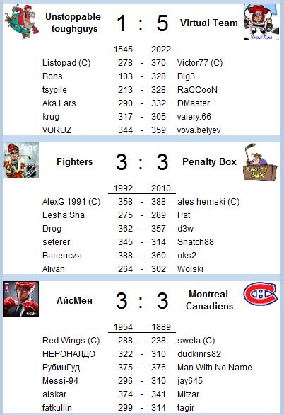 Alivan: В новом турнире уже будут играть 14 команд, 7 из предыдущего турнира и 7 новых, жаль распалась Дзамбони. Среди новичков много новых и незнакомых имен, но конечно есть и известные игроки, особенно впечатляют составы Penalty box и Ice Wolves, но уверен и другие команды себя покажут.