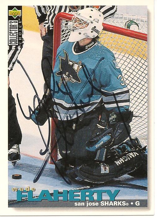Уэйд Флаерти. Был задрафтован "Баффало" в 1988 году в 9 раунде, под общим 181 номером. 3 Сентября 1991 года на правах свободного агента подписал контракт с "Сан-Хосе". Первые 2 сезона за основу "Шаркс" Флаерти проведет всего 4 матча, в большенстве своем будет выступать за клуб ИХЛ - "Канзас Сити". Флаерти провел за "Канзас" 121 игру. Сокращенный сезон 1994-95 позволил Уэйду закрепиться в основе "Шаркс", провести 18 матчей в регулярке, а так же 7 в плей-офф, одержать 2 победы. В следующем сезоне Флаерти пришлось бороться с многими вратарями за место в основе, но сумел провести 24 матча, к сожалению, одержал всего 3 победы. В сезоне 1996-97 Уэйд получил травму - сломал ключицу, из-за этого сыграл только 7 матчей в регулярке, затем был сослан в фарм-клуб. Всего Флаерти провел: 5 сезонов, сыграл 53 матча, одержал 10 побед. Полная статистика: