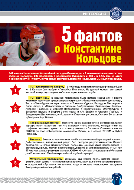 144 матча в Национальной хоккейной лиге, две Олимпиады и 9 чемпионатов мира в составе сборной Беларуси, 237 поединков в российской Суперлиге и 353 – в КХЛ. Уже из этого перечня понятно, что пять интересных фактов о Константине Кольцове мы нашли без труда.