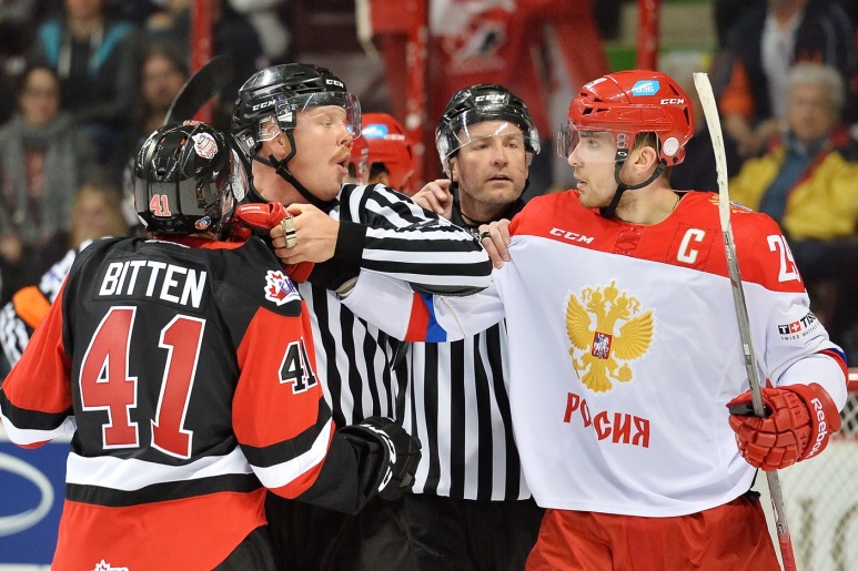 Никита Жульдиков выясняет отношения с нападающим сборной OHL Уильямом Биттеном во время Суперсерии