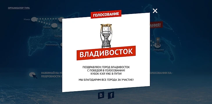 На этой неделе стали известны его итоги – последним городом в туре стал Владивосток, который получил 5063 голоса. Дальневосточники серьезно опередили своих основных конкурентов – Ярославль (3247) и Уфу (2167) и включили себя одиннадцатыми в маршрут заветной чаши.