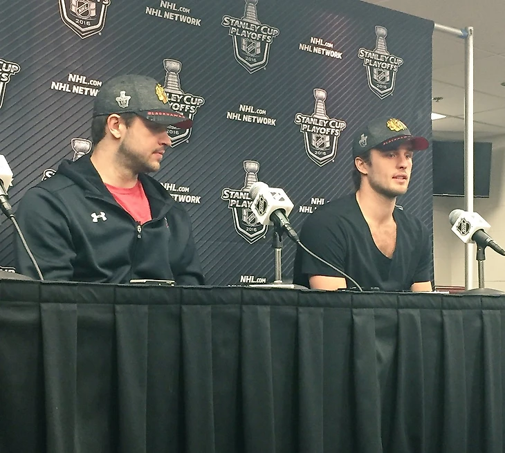 16 апреля хоккеисты "Блэкхокс", вернувшись в Чикаго, отвечают на вопросы прессы.
