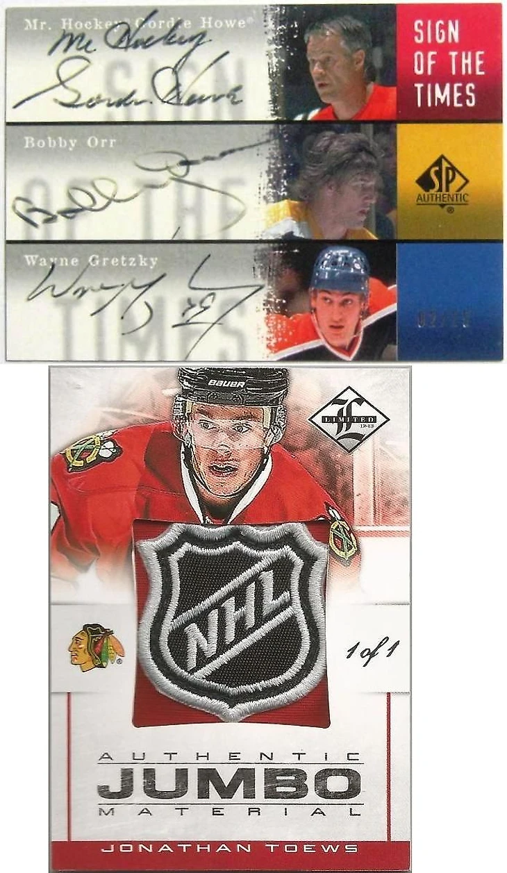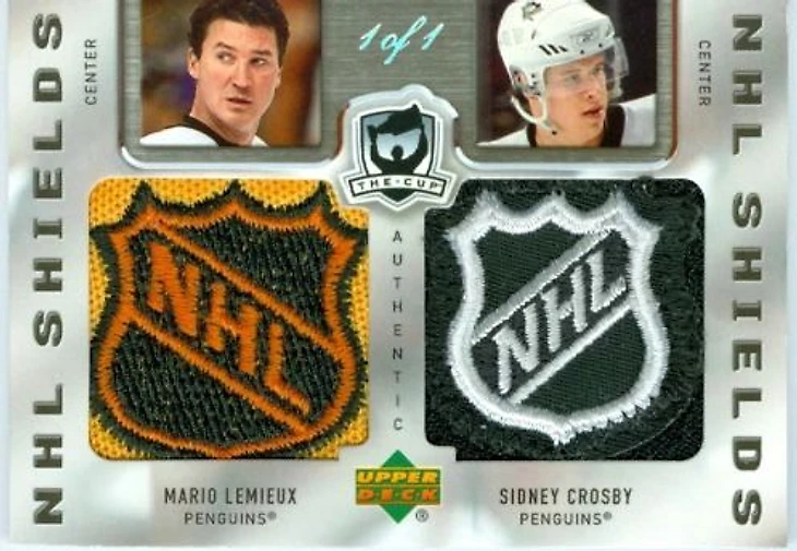 На первом же месте, без какой либо конкуренции, разместились две главные легенды Питтсбурга (да простят меня фанаты Ягра и Малкина). Двойной шильд Марио Лемье и Сидни Кросби из дебютного сезона последнего был продан за 59999,95$. Это The Cup 2005-06. Просто космос. Но и появляются в продаже подобные карты ну очень редко. Жалко, что нет фото в лучшем качестве…