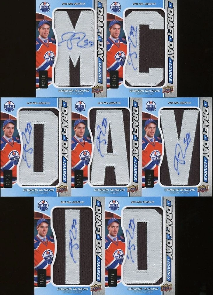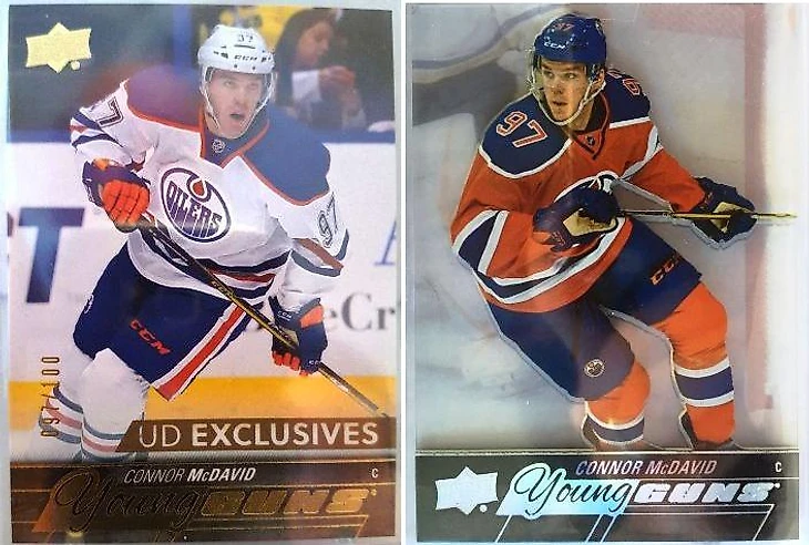 На втором и третьем месте с небольшим отрывом две уже известные читателям блога карточки. Это Young Guns Exclusives Коннора МакДэвида. Здесь интересен номер 97/100 – это игровой номер нападающего Эдмонтона, поэтому именно эта карта немного более желанна для коллекционеров, чем 99 ей аналогичных. Отсюда цена выше аналогов – 3000$. На 300$ дороже Young Guns Acetate того же МакДэвида из Series 2. Карта не нумерована, но судя по ценам, тираж не больше, чем у вышеописанной вариации.