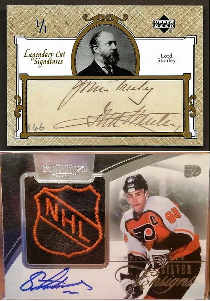 Еще немного дороже оценили покупатели автограф самого лорда Стэнли, учередившего главный хоккейный кубок Северной Америки (а возможно и мира). В карточку была вставлена бумажка, содержащая автограф, а найти её можно было в коллекции Upper Deck Series 2 2001-02. Цена карты по состоянию на апрель 2016 года 1075,51$. Надо сказать, что аналогичный автограф из коллекции Panini Dominion в начале этого года был продан гораздо дороже, так что до рекордов тут далеко…