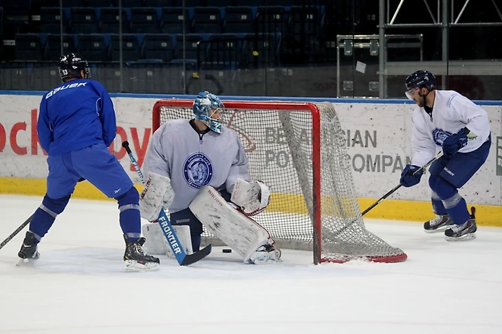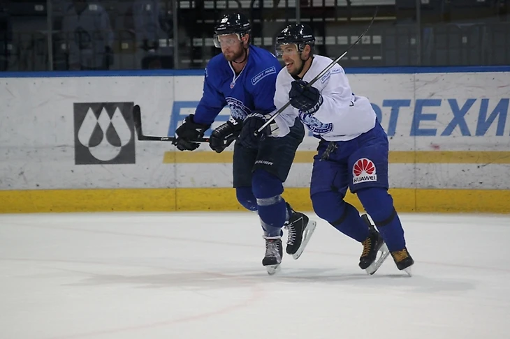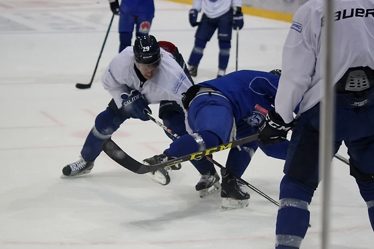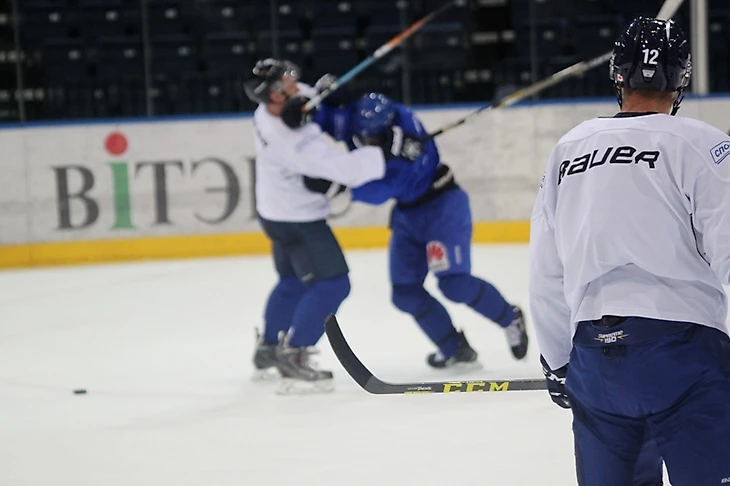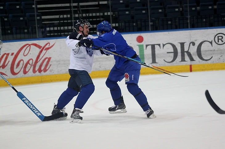 Это была первая тренировка на льду для команды, и тренеры не ставили перед игроками сверхсложных задач, однако требовали от всех выкладываться на полную. Не пугайтесь, на фотографиях ниже совсем не драка, а абсолютно игровой момент. Целью данного упражнения для защитника было любой ценой не подпустить форварда условных «соперников» к шайбе. Евгений Лисовец выполнил задание на крепкую пятерку.