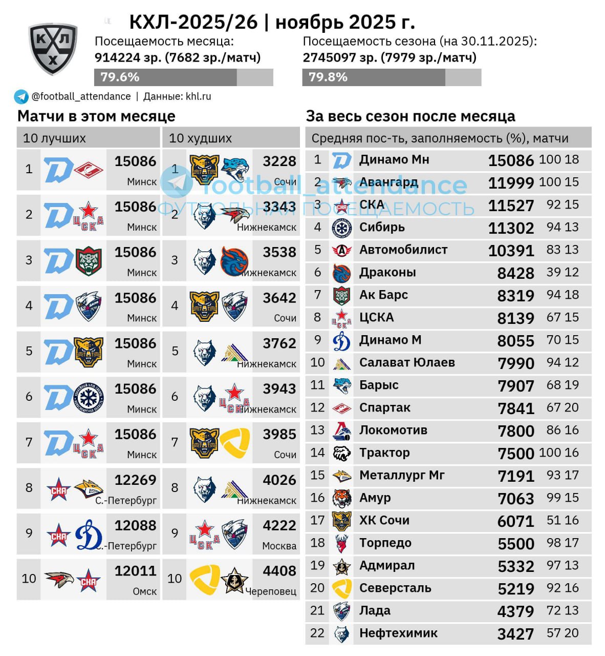 Футбол: посещаемость и карты / Посещаемость матчей КХЛ в ноябре