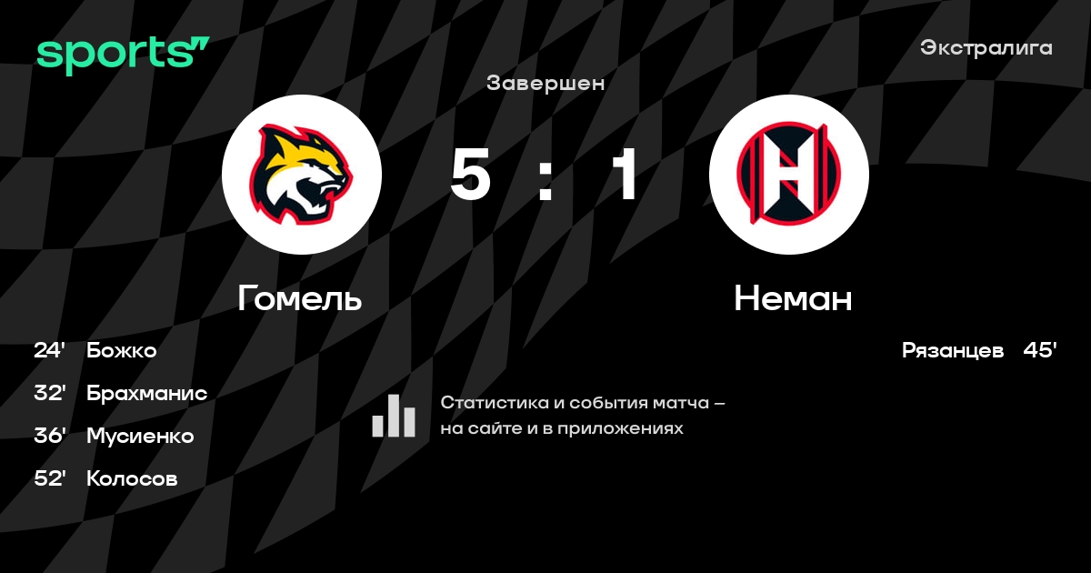 В прошедшем матче в рамках турнира Экстралига состоялась встреча команд Гомель - Неман в городе Гомель (Беларусь) на стадионе Ледовый дворец Гомель (вместимость - 2700)