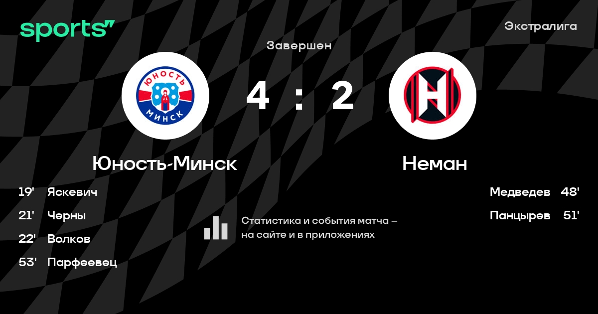 В прошедшем матче в рамках турнира Экстралига состоялась встреча команд Юность-Минск - Неман в городе Минск (Беларусь) на стадионе Чижовка-Арена (вместимость - 9487)