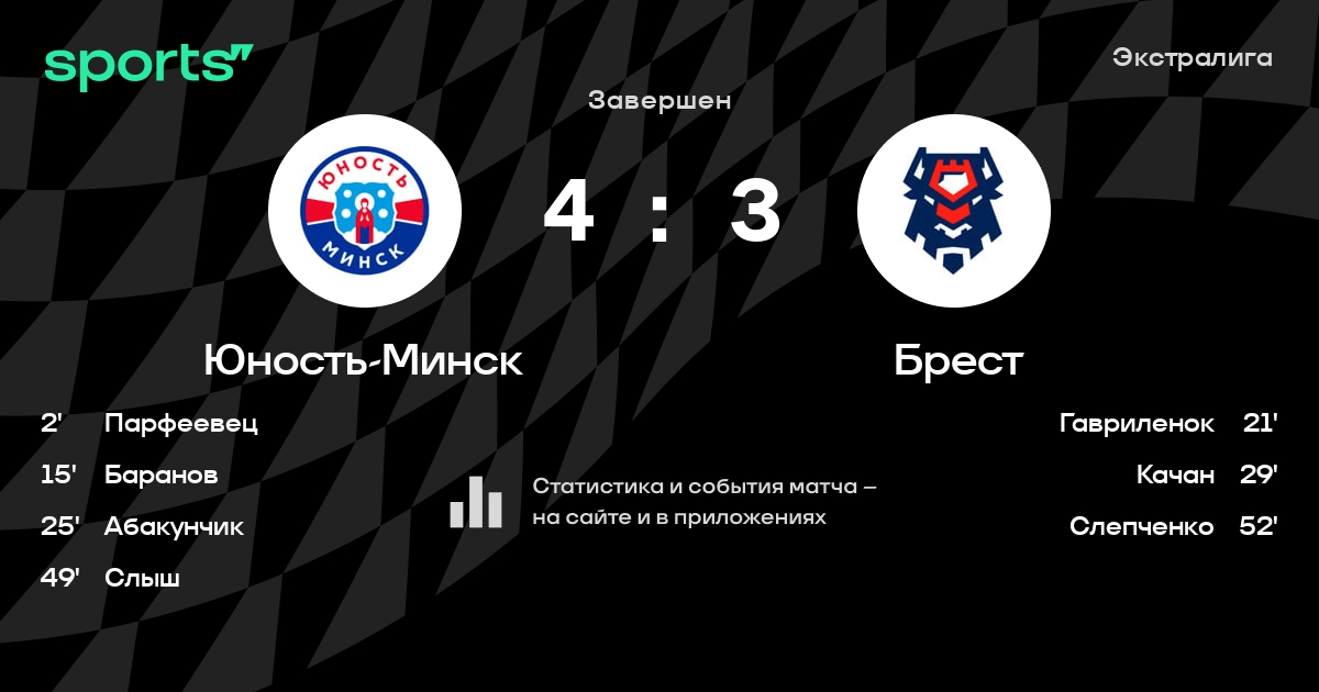 В прошедшем матче в рамках турнира Экстралига состоялась встреча команд Юность-Минск - Брест в городе Минск (Беларусь) на стадионе Чижовка-Арена (вместимость - 9487)