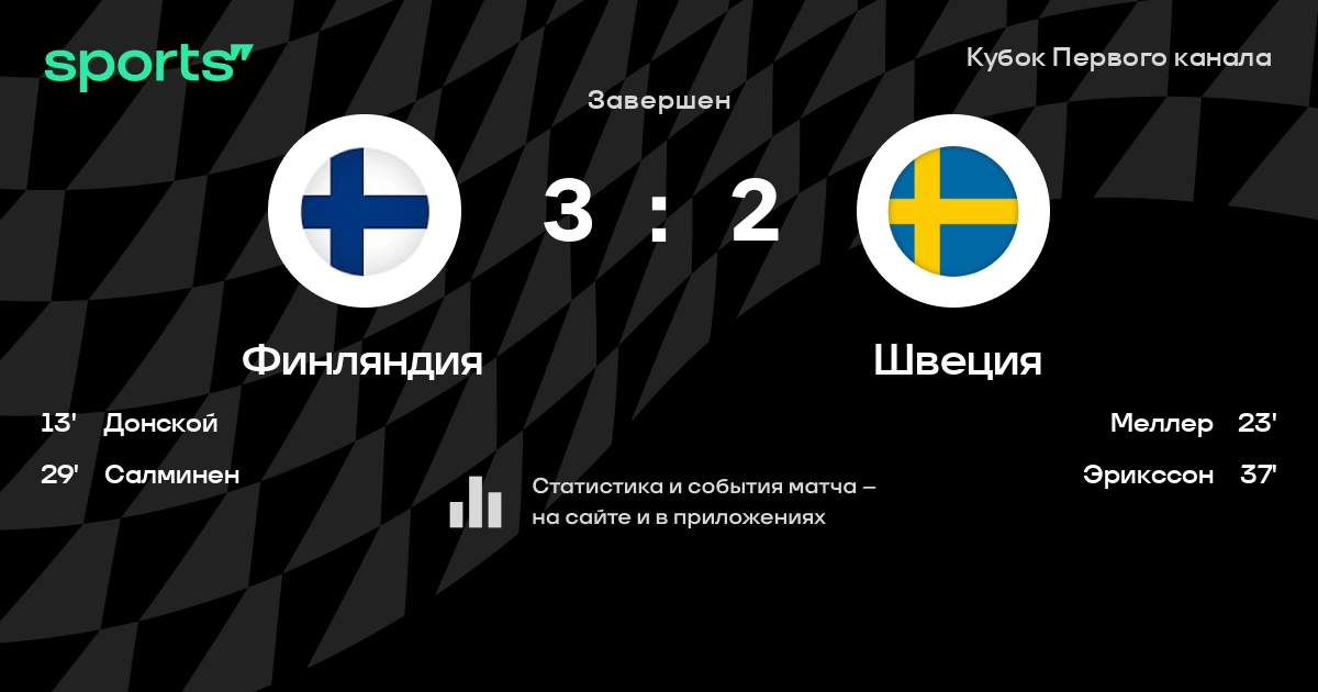 В прошедшем матче в рамках турнира Кубок Первого канала состоялась встреча команд Финляндия - Швеция в городе Сочи (Россия) на стадионе Большой (вместимость - 12000)