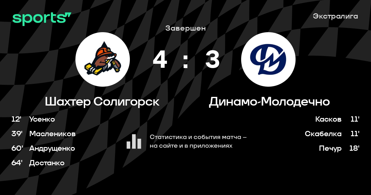 В прошедшем матче в рамках турнира Экстралига состоялась встреча команд Шахтер Солигорск - Динамо-Молодечно в городе Солигорск (Беларусь) на стадионе Ледовый дворец спорта Солигорск (вместимость - 1800)